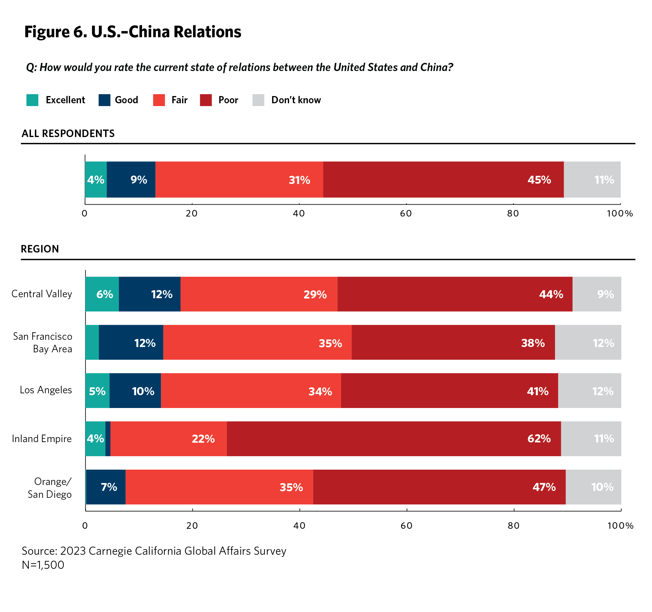 A vast majority of Californians recognize relations with China as important to the United States: 43 percent say very important, and 38 percent say somewhat important. But, as figure 6 shows, many believe that the relationship between the two countries is in poor standing. Forty-five percent of respondents consider the current state of the relationship to be poor, whereas only 4 percent say it is excellent, 9 percent good, and 32 percent fair. Democrats are most likely to say the relationship is fair (at 41 percent), while majorities of Republicans (61 percent) and independents (59 percent) say it is poor.