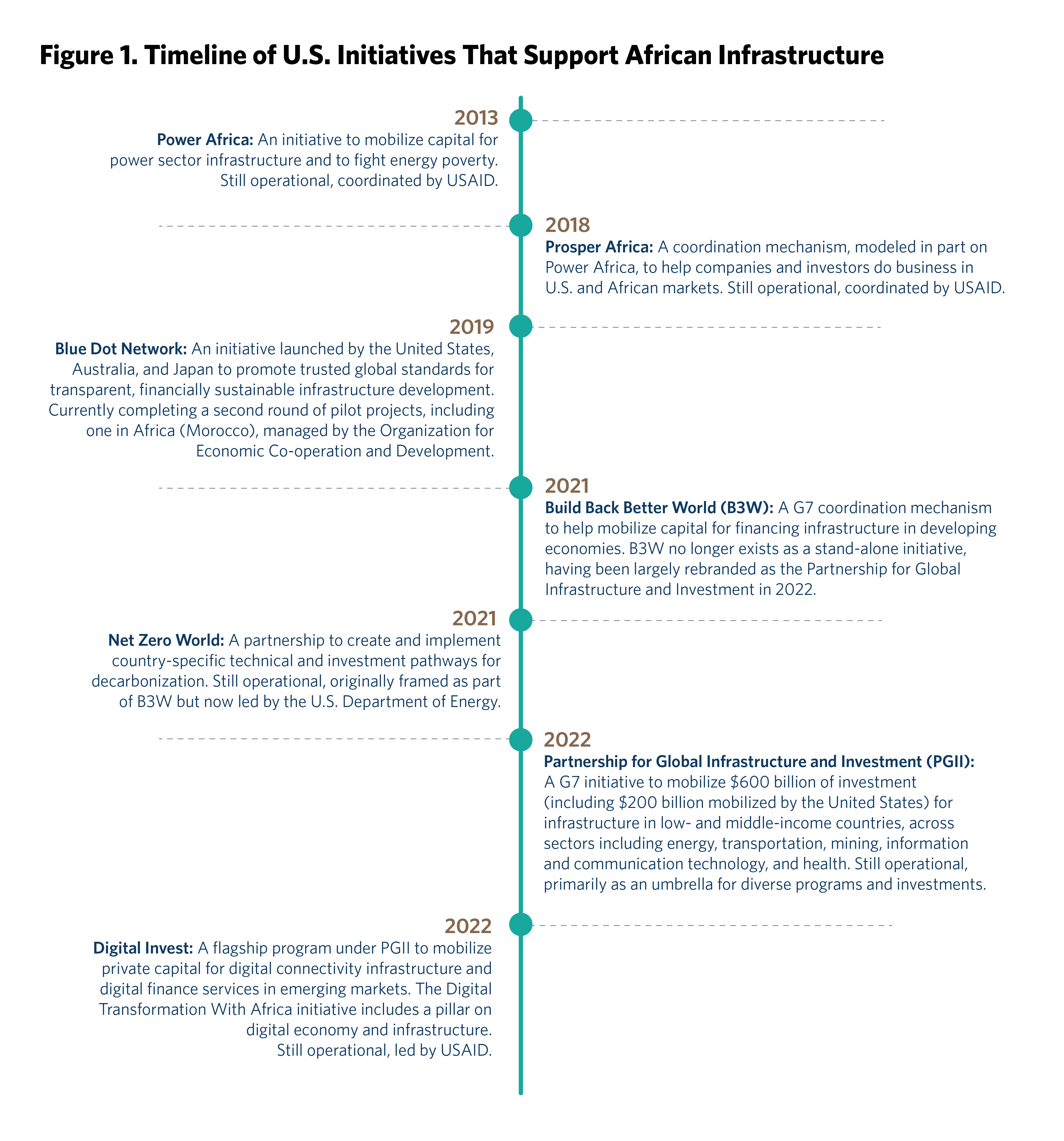 1. Multiple U.S. global infrastructure initiatives have been announced with great fanfare over the years, but some of them quietly disappeared from the headlines shortly afterward. Since 2013, the United States has announced at least seven major initiatives with significant relevance for African infrastructure (see Figure 1). Some, including Power Africa and Prosper Africa, have become enduring components of U.S. foreign policy with bipartisan support. Others, like the Blue Dot Network, are ongoing multilateral efforts. But several, such as Build Back Better World, have since been transformed, significantly reoriented, or absorbed into follow-on initiatives. Such a complex landscape can leave international partners unsure about what is actually being funded and how each new initiative differs from the last.